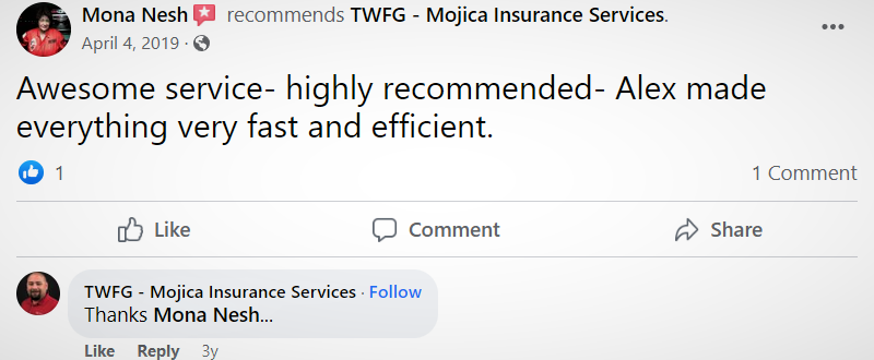 "Alex really does his research to find the right policy for your needs!" Source: https://www.facebook.com/MojicaInsuranceServices/reviews