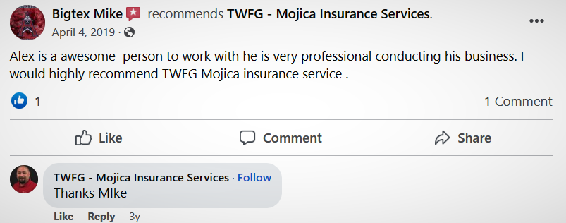 "Alex is a awesome person to work with he is very professional conducting his business..." Source: https://www.facebook.com/MojicaInsuranceServices/reviews