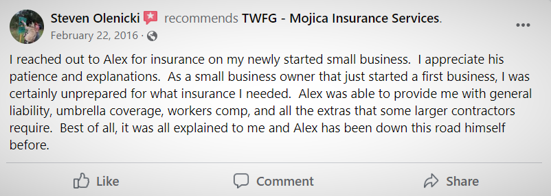 "Alex was able to provide me with general liability, umbrella coverage, workers comp, and all the extras that some larger contractors require. Best of all, it was explained to me and Alex has been down this road himself before." Source: https://www.facebook.com/MojicaInsuranceServices/reviews
