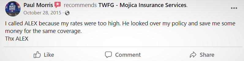 "...save me some money for the same coverage." Source: https://www.facebook.com/MojicaInsuranceServices/reviews